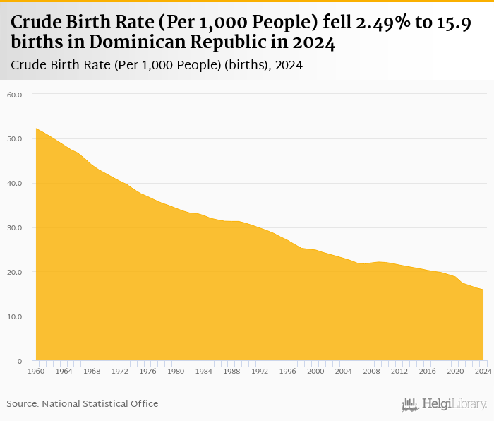 Crude birth rate per 1,000 people fell 2.49% to 15.9 births in Dominican Republic in 2024, according to the National Statistical Office.