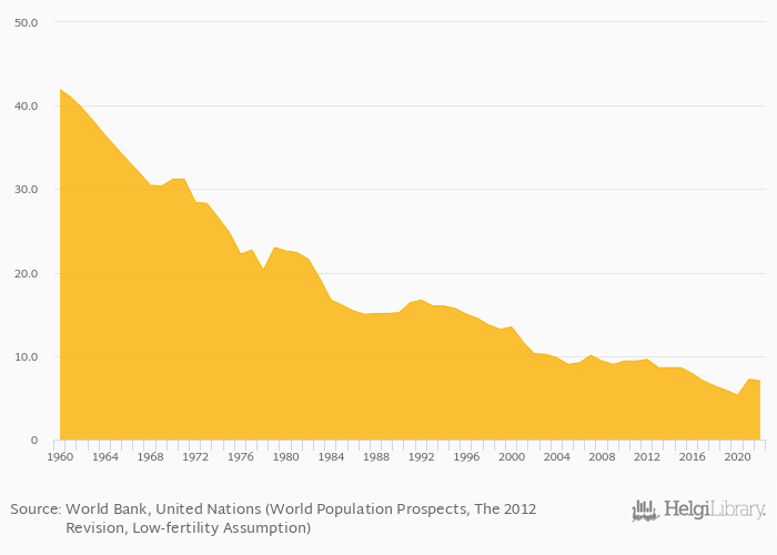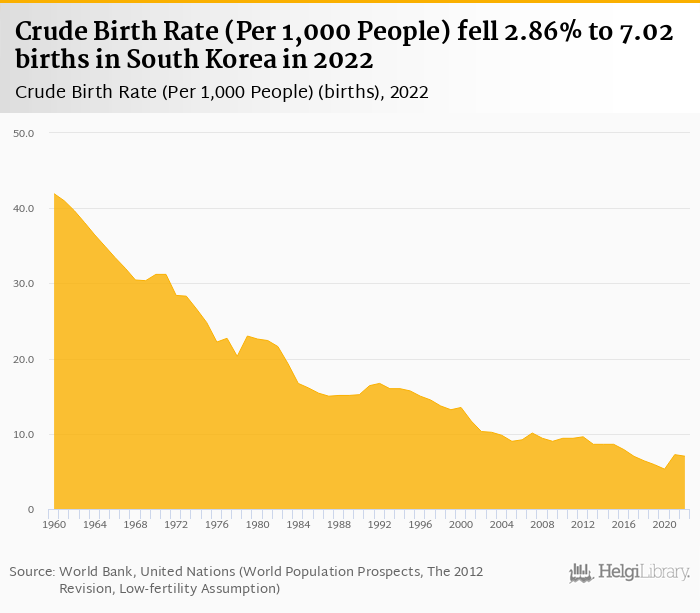 Crude birth rate per 1,000 people fell 2.86% to 7.02 births in South Korea in 2022, according to the National Statistical Office.