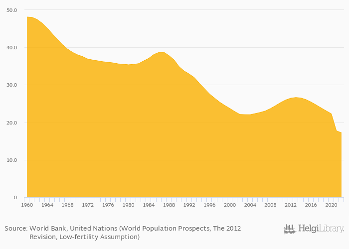Historically, crude birth rate per 1,000 people in Turkmenistan reached an all time high of 48.1 births in 1960 and an all time low of 17.2 births in 2022. When compared to Turkmenistan's main peers, crude birth rate per 1,000 people in Afghanistan amounted to 28.7 births, 14.1 births in Iran, 16.4 births in Kazakhstan and 17.1 births in Uzbekistan in 2022.