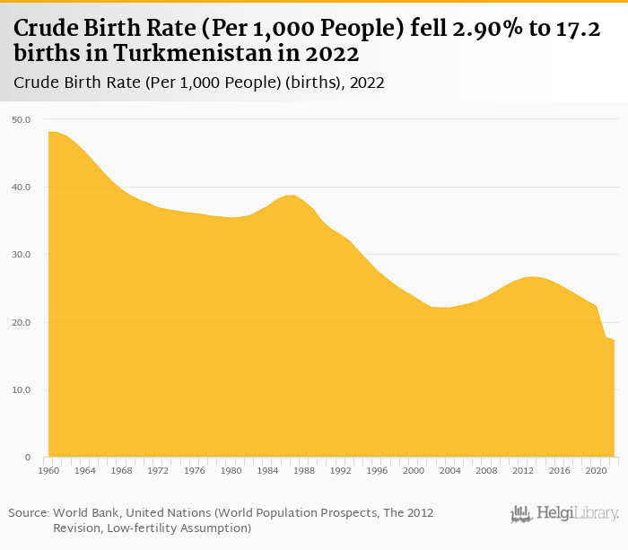 Crude birth rate per 1,000 people fell 2.90% to 17.2 births in Turkmenistan in 2022, according to the National Statistical Office.