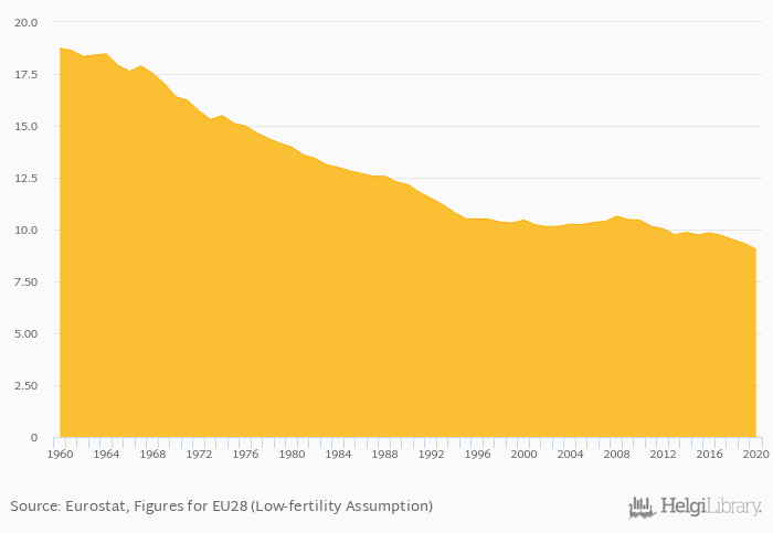 Historically, crude birth rate per 1,000 people in the European Union reached an all time high of 18.7 births in 1960 and an all time low of 9.05 births in 2020. When compared to European Union's main peers, crude birth rate per 1,000 people in China amounted to 8.52 births, 6.80 births in Japan, 9.80 births in Russia and 10.9 births in USA in 2020.