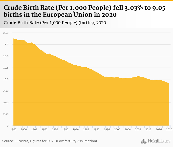Crude birth rate per 1,000 people fell 3.03% to 9.05 births in the European Union in 2020, according to the National Statistical Office.