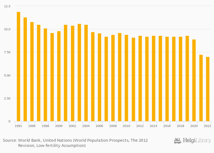 Historically, crude birth rate per 1,000 people in Serbia reached an all time high of 11.9 births in 1991 and an all time low of 7.00 births in 2022. When compared to Serbia's main peers, crude birth rate per 1,000 people in Bosnia and Herzegovina amounted to 6.91 births, 7.22 births in Croatia, 7.41 births in Hungary and 7.60 births in Romania in 2022.