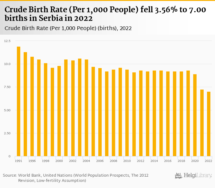 Crude birth rate per 1,000 people fell 3.56% to 7.00 births in Serbia in 2022, according to the National Statistical Office.