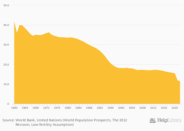 Historically, crude birth rate per 1,000 people in Vietnam reached an all time high of 41.3 births in 1960 and an all time low of 11.4 births in 2022. When compared to Vietnam's main peers, crude birth rate per 1,000 people in Cambodia amounted to 20.9 births, 9.86 births in China, 22.1 births in Laos and 7.11 births in Thailand in 2022.