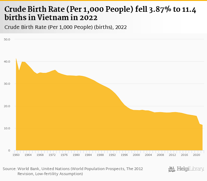 Crude birth rate per 1,000 people fell 3.87% to 11.4 births in Vietnam in 2022, according to the National Statistical Office.