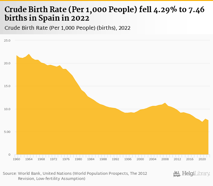Crude birth rate per 1,000 people fell 4.29% to 7.46 births in Spain in 2022, according to the National Statistical Office.