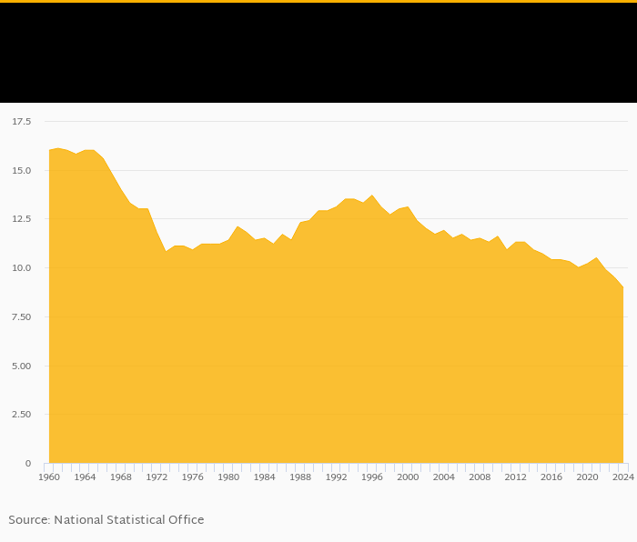 Crude birth rate per 1,000 people fell 5.55% to 8.97 births in Luxembourg in 2024, according to the National Statistical Office.
