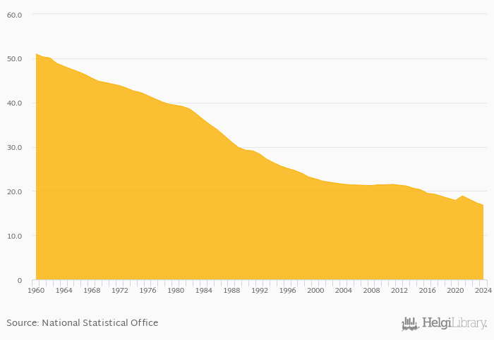 Historically, crude birth rate per 1,000 people in Morocco reached an all time high of 50.8 births in 1960 and an all time low of 16.7 births in 2023. When compared to Morocco's main peers, crude birth rate per 1,000 people in Algeria amounted to 17.6 births, 29.3 births in Mauritania, 6.90 births in Spain and 12.4 births in Tunisia in 2024.
