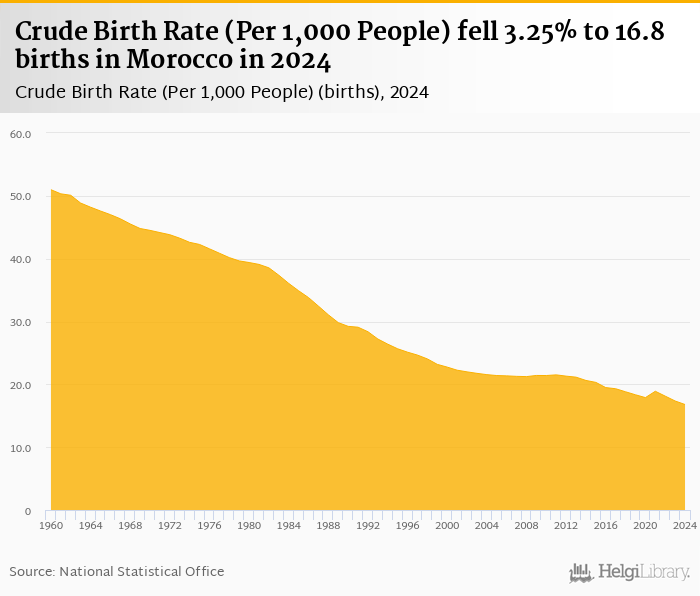 Crude birth rate per 1,000 people rose 0.516% to 16.8 births in Morocco in 2024, according to the National Statistical Office.