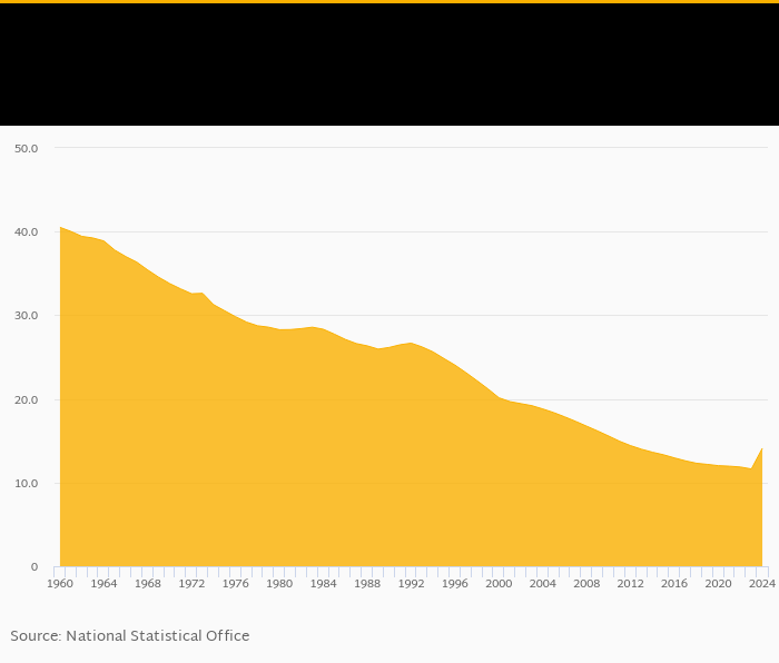 Crude birth rate per 1,000 people rose 21.3% to 14.1 births in Jamaica in 2024, according to the National Statistical Office.