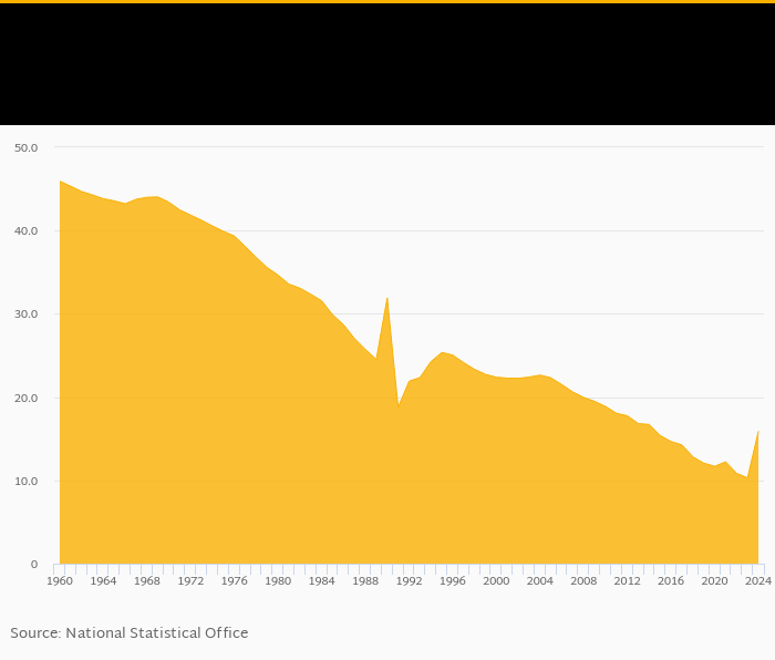 Crude birth rate per 1,000 people rose 54.4% to 15.9 births in Kuwait in 2024, according to the National Statistical Office.