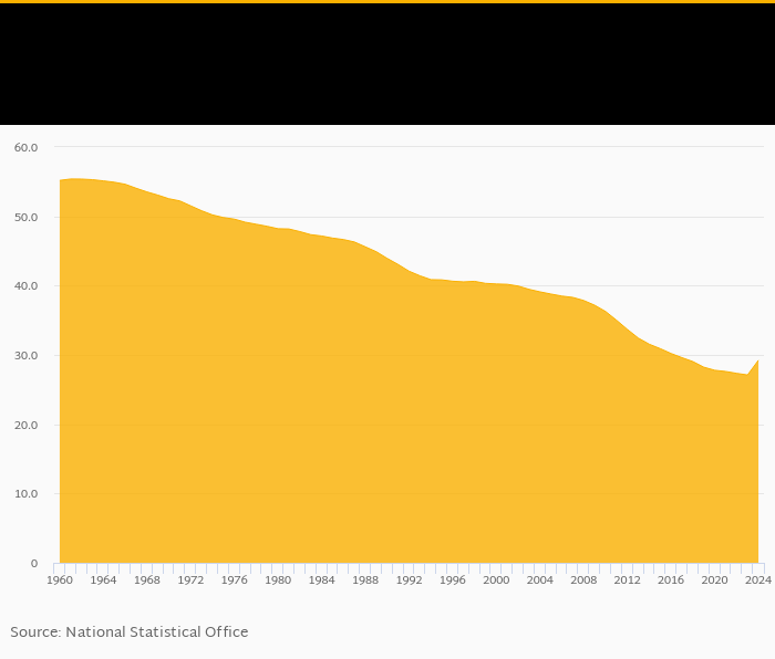 Crude birth rate per 1,000 people rose 7.85% to 29.2 births in Kenya in 2024, according to the National Statistical Office.