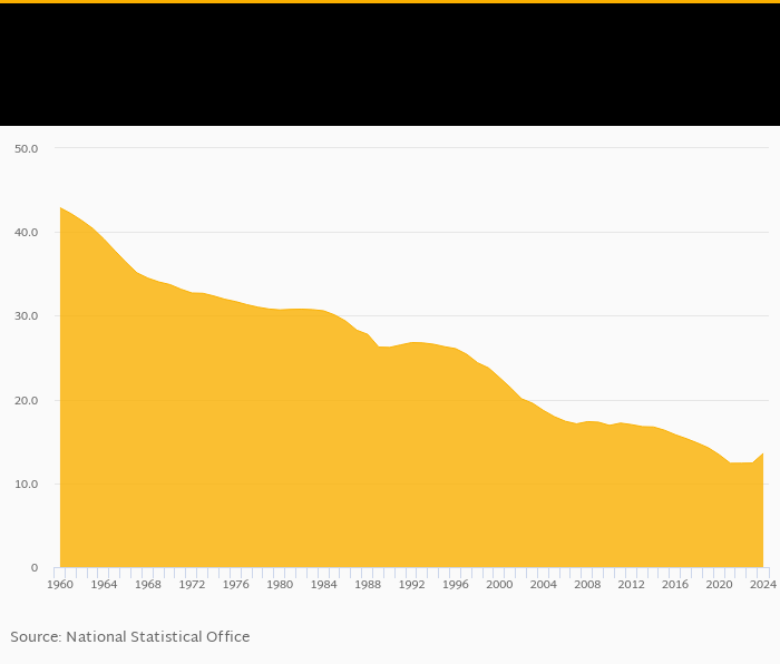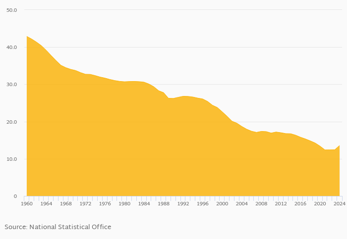 Crude birth rate per 1,000 people rose 9.35% to 13.6 births in Malaysia in 2024, according to the National Statistical Office.