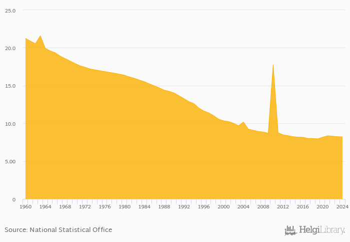 Historically, crude death rate per 1,000 people in Haiti reached an all time high of 21.6 deaths in 1963 and an all time low of 7.95 deaths in 2019. When compared to Haiti's main peers, crude death rate per 1,000 people in Cuba amounted to 8.48 deaths, 6.16 deaths in Dominican Republic, 7.38 deaths in Jamaica and 8.44 deaths in Puerto Rico in 2024.