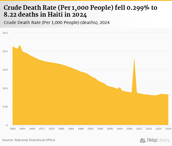 Crude death rate per 1,000 people fell 0.299% to 8.22 deaths in Haiti in 2024, according to the National Statistical Office.