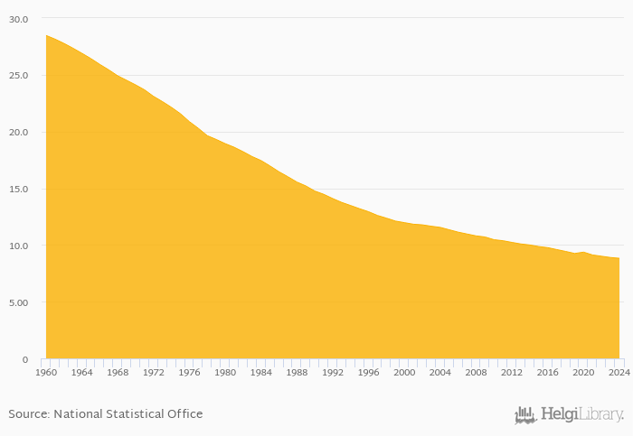 Historically, crude death rate per 1,000 people in Benin reached an all time high of 28.5 deaths in 1960 and an all time low of 8.82 deaths in 2024. When compared to Benin's main peers, crude death rate per 1,000 people in Burkina Faso amounted to 9.48 deaths, 9.22 deaths in Niger, 11.6 deaths in Nigeria and 9.54 deaths in Togo in 2024.