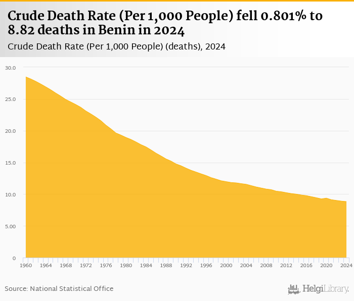 Crude death rate per 1,000 people fell 0.801% to 8.82 deaths in Benin in 2024, according to the National Statistical Office.