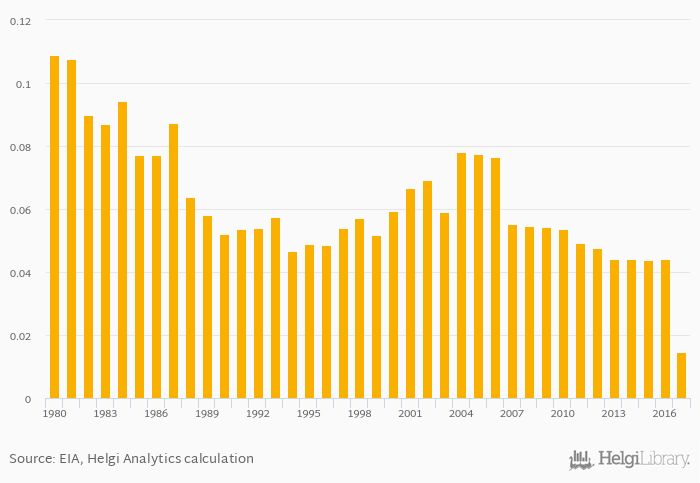 Crude oil reserves as a share of worldwide reserves fell 66.6% to 0.015% in Trinidad and Tobago in 2017, according to EIA.