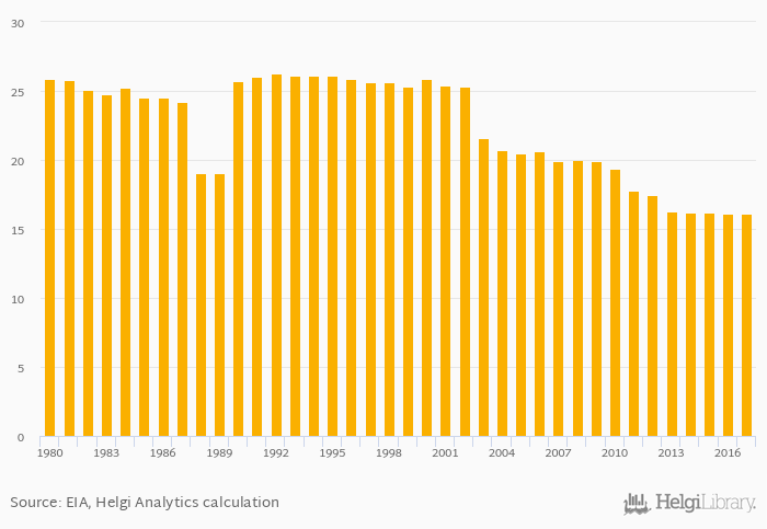 Crude oil reserves as a share of worldwide reserves fell 0.046% to 16.1% in Saudi Arabia in 2017, according to EIA.