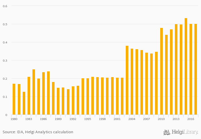 Crude oil reserves as a share of worldwide reserves rose 0% to 0.501% in Ecuador in 2017, according to EIA.