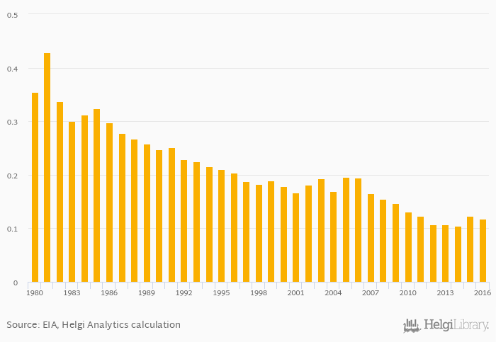 Crude oil supply as a share of worldwide supply fell 5.02% to 0.117% in Trinidad and Tobago in 2016, according to EIA.