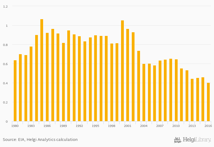 Crude oil supply as a share of worldwide supply fell 12.0% to 0.405% in Australia in 2016, according to EIA.