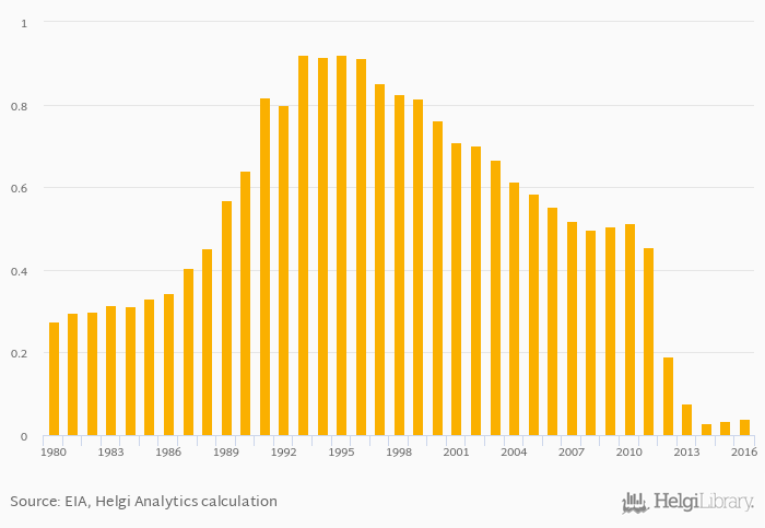 Crude oil supply as a share of worldwide supply rose 16.7% to 0.040% in Syria in 2016, according to EIA.