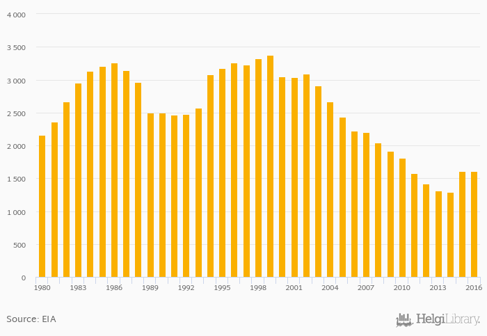 Crude oil supply fell 0.434% to 1,605 '000 bpd in the European Union in 2016, according to EIA.