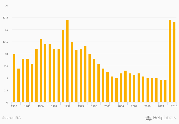 Crude oil supply fell 2.96% to 16.5 '000 bpd in Japan in 2016, according to EIA.
