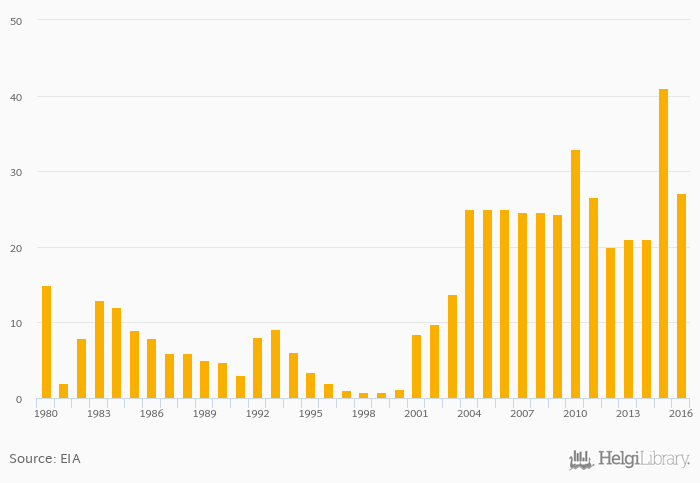 Crude oil supply fell 33.8% to 27.1 '000 bpd in Philippines in 2016, according to EIA.