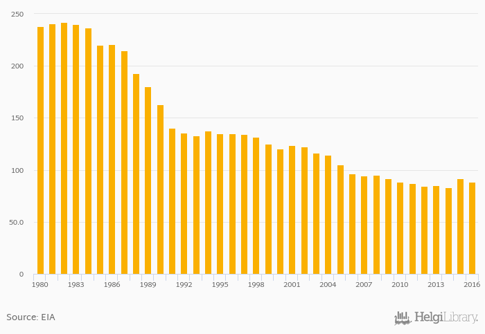Crude oil supply fell 3.64% to 88.6 '000 bpd in Romania in 2016, according to EIA.