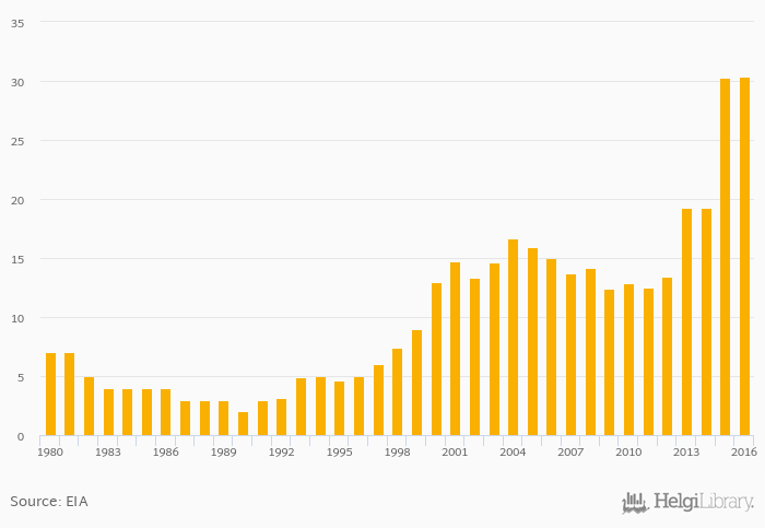 Crude oil supply rose 0.525% to 30.4 '000 bpd in Poland in 2016, according to EIA.