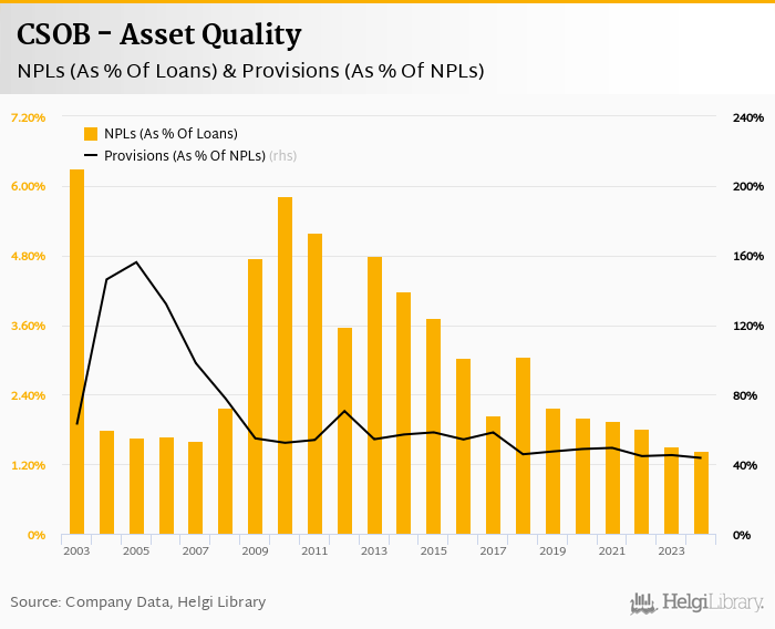 Comparing CSOB with its closest peers, Ceska Sporitelna operated at the end of 2024 with NPL ratio of 1.80% and provision coverage of 102% and Komercni Banka with 1.94% and 44.3% respectively.