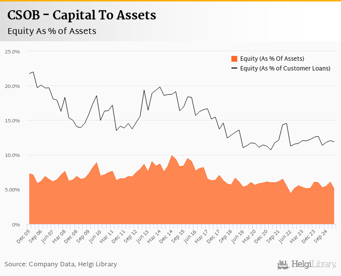 CSOB's Equity reached 5.11% of total assets in the 1Q2025, down from 5.98% for the previous year. As a share of net customer loans, the ratio amounted to 11.9% at the end of the first quarter of 2025.