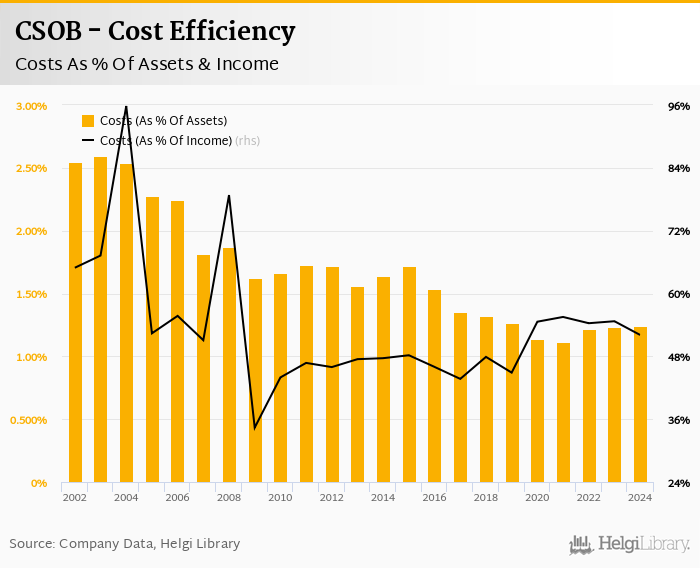 Comparing CSOB with its closest peers, Ceska Sporitelna operated in 2024 with a cost to income ratio of 43.0% in 2024, and Komercni Banka reached 48.2%.