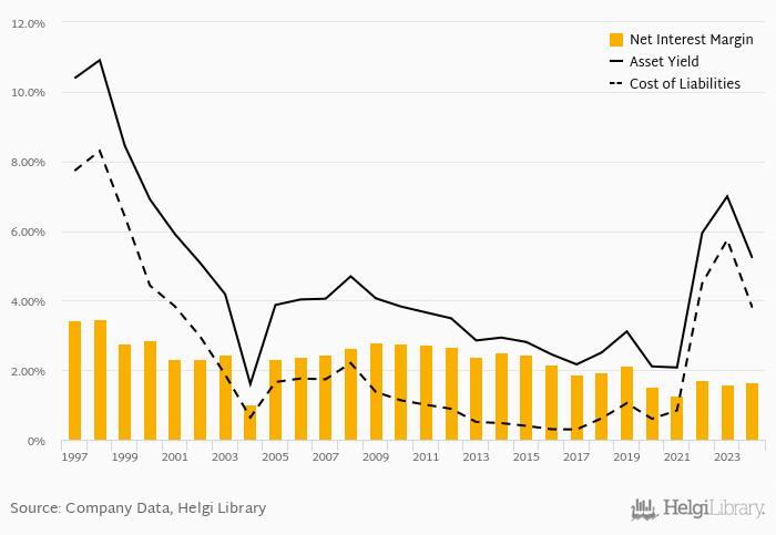 Historically, the bank’s net interest margin reached an all time high of 3.48% in 1998 and an all time low of 1.01% in 2004. The average margin in the last five years amounted to 1.56%.