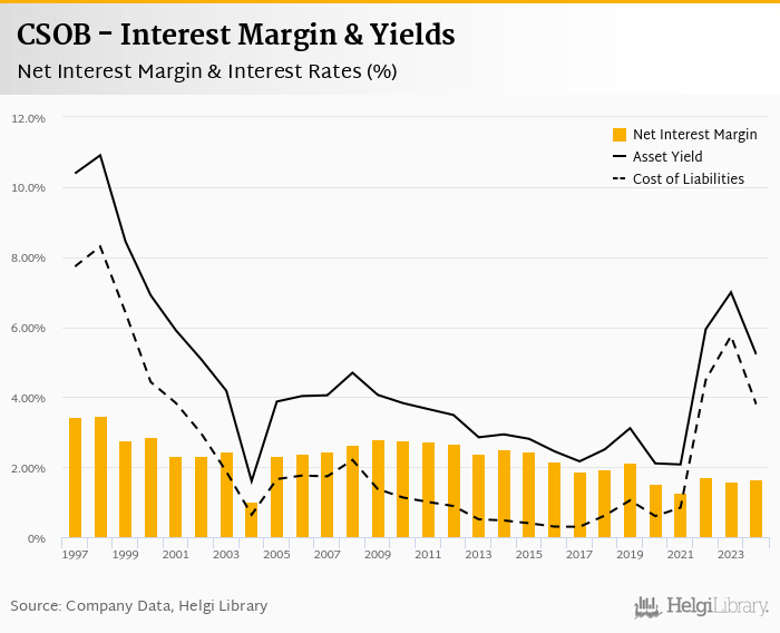 Comparing CSOB with its closest peers, Ceska Sporitelna operated in 2024 with a net interest margin of 2.08% in 2024, and Komercni Banka reached 1.66%.