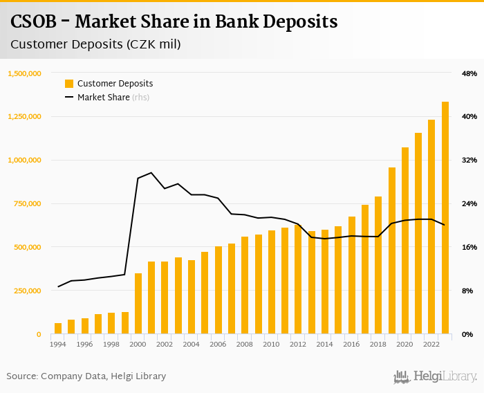 CSOB accounted for 19.9% of all customer deposits taken by banks in Czechia at the end of 2023. Historically, the bank’s market share in customer deposits reached an all time high of 29.6% in 2001 and an all time low of 8.58% in 1994.