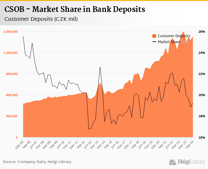 CSOB accounted for 19.2% of all customer deposits taken by banks in Czechia at the end of 2024-09-30. Historically, the bank’s market share in customer deposits reached an all time high of 25.5% in 2005-12-31 and an all time low of 16.8% in 2013-03-31.