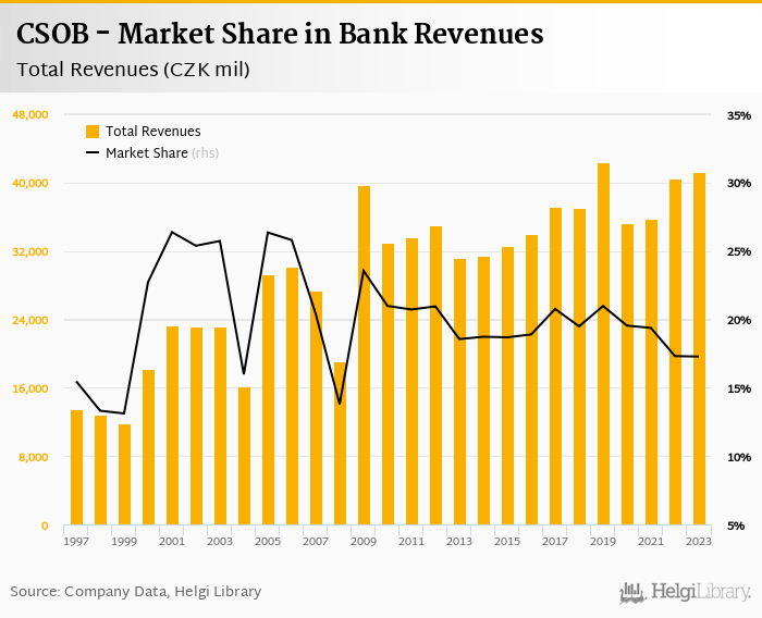 As a result, CSOB accounted for 17.3% of all bank revenues generated by banks in Czechia in 2023. Historically, the bank’s market share in total revenues reached an all time high of 26.4% in 2001 and an all time low of 13.1% in 1999.