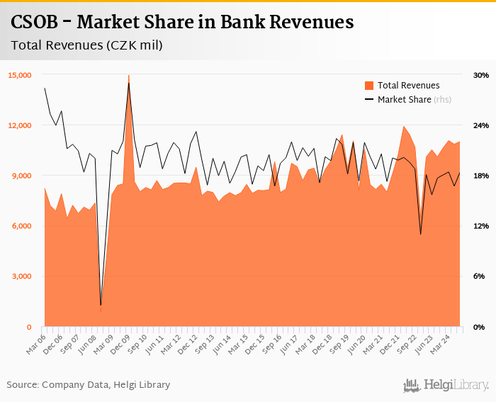 As a result, CSOB accounted for 18.3% of all bank revenues generated by banks in Czechia in 2024-09-30. Historically, the bank’s market share in total revenues reached an all time high of 29.0% in 2009-12-31 and an all time low of 2.50% in 2008-09-30.