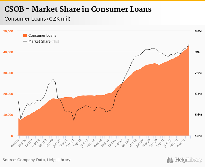 CSOB's consumer loans reached CZK 43,200 mil in 2024-06-30, up 4.22% compared to the previous year.