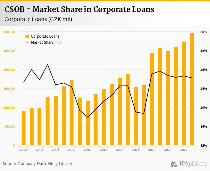 CSOB accounted for 26.2% of all corporate loans issued in Czechia at the end of 2023. Historically, the bank’s market share in corporate loans reached an all time high of 29.1% in 2005 and an all time low of 17.9% in 2010.