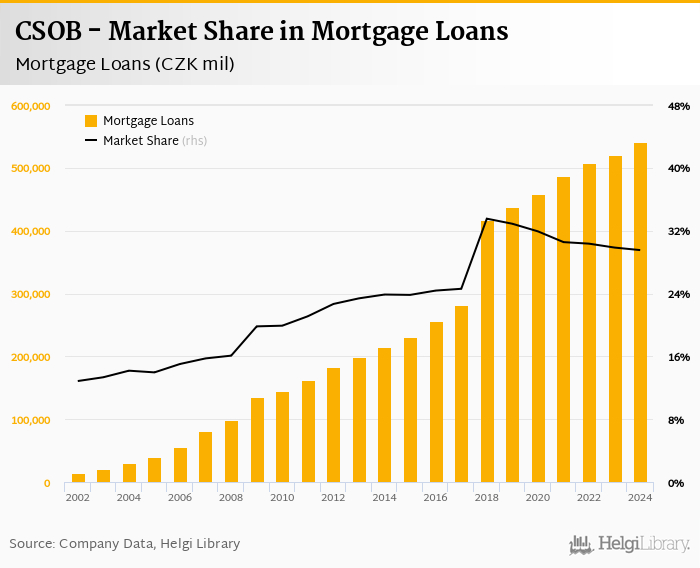 CSOB accounted for 29.5% of all mortgage loans issued in Czechia at the end of 2024. Historically, the bank’s market share in mortgage loans reached an all time high of 33.5% in 2018 and an all time low of 12.9% in 2002.