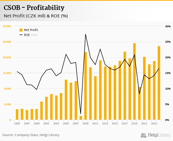CSOB made a net profit of CZK 18,908 mil in 2024, up 25.3% compared to the previous year. This implies a return on equity of 16.4%.