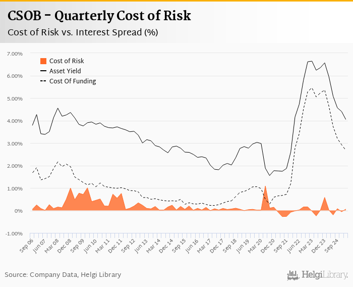 CSOB's Cost of Risk (loan loss provisions as % of total assets) amounted to 0.059% in the first quarter of 2025, up from -0.057% when compared to the previous quarter.
