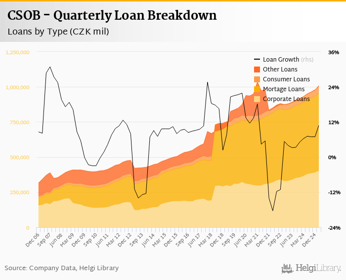 Mortgage loans represented 54.5% of the bank's loan book at the end of the year 1Q2025, consumer further 4.81% and corporate loans 40.0% of total loans.