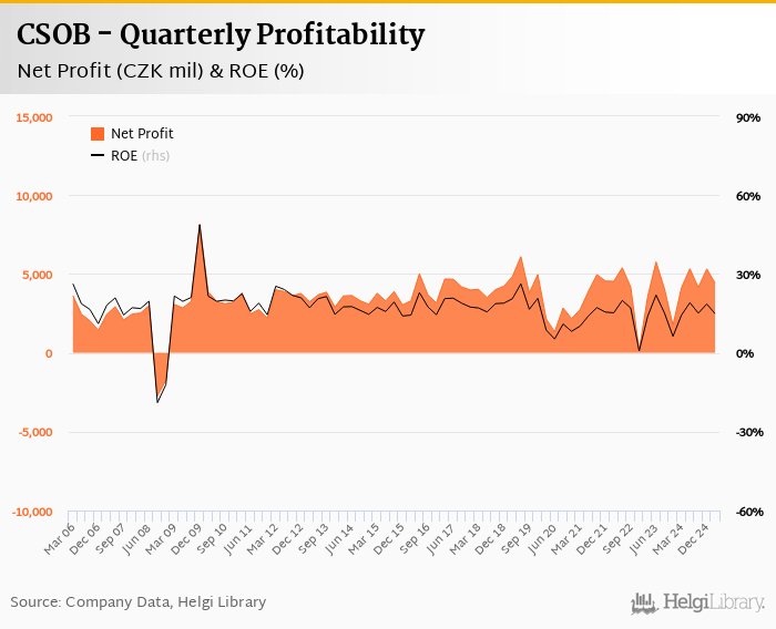 CSOB made a net profit of CZK 4,403 mil in the first quarter of 2025, up 6.92% when compared to the same period of last year. This implies a return on equity of 14.8%.