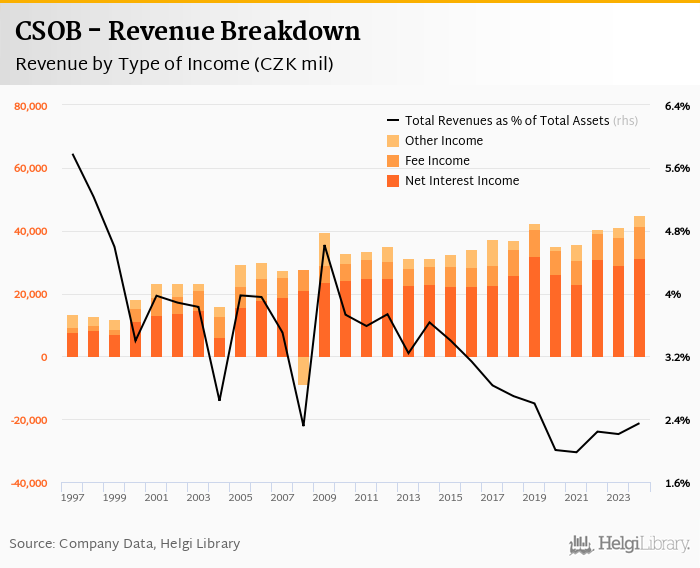 Comparing CSOB with its closest peers, Ceska Sporitelna generated total revenues of 2.78% of assets in 2024, and Komercni Banka operated with 2.39% revenue margin.